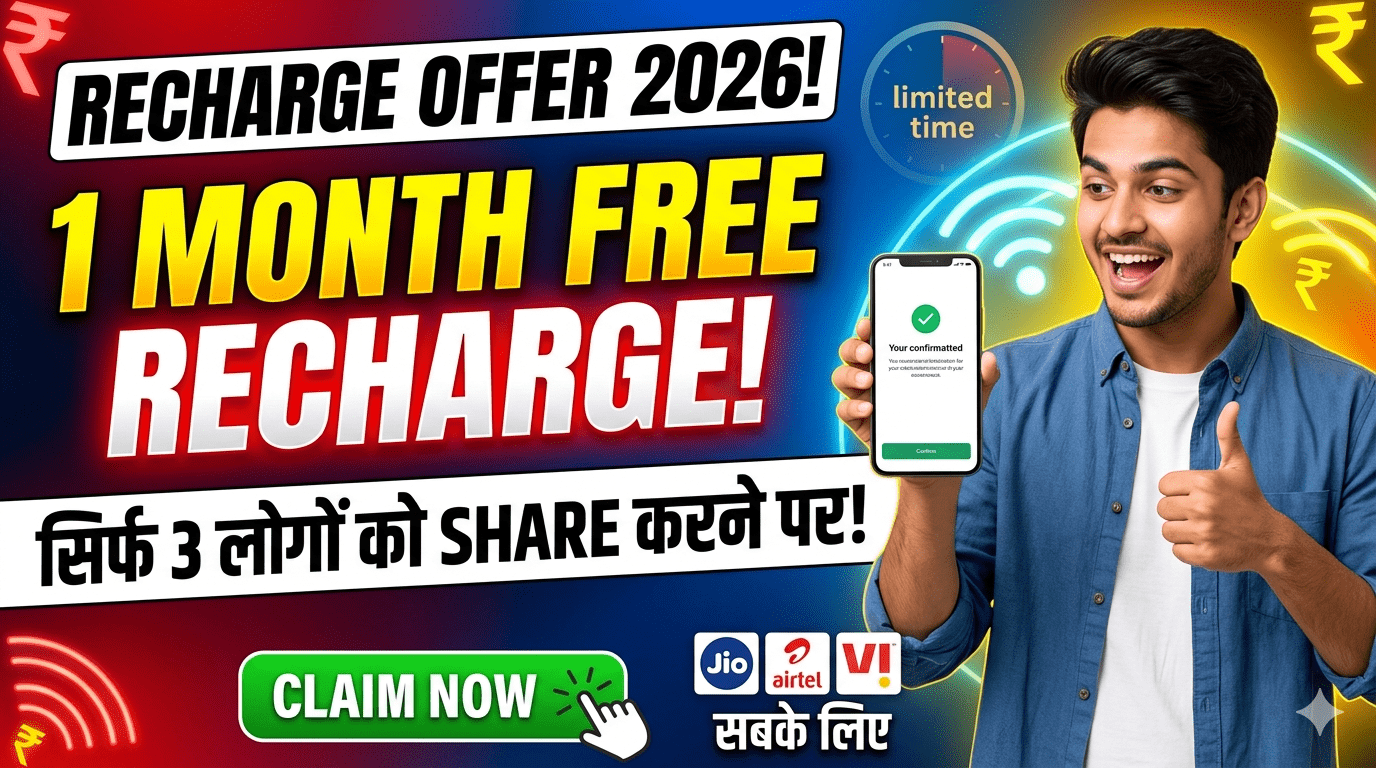 Recharge Offer 2026: ​धोखा नहीं, सच है! 3 दोस्तों को WhatsApp पर भेजें और अभी एक्टिवेट करें अपना 1 Month Free Recharge।